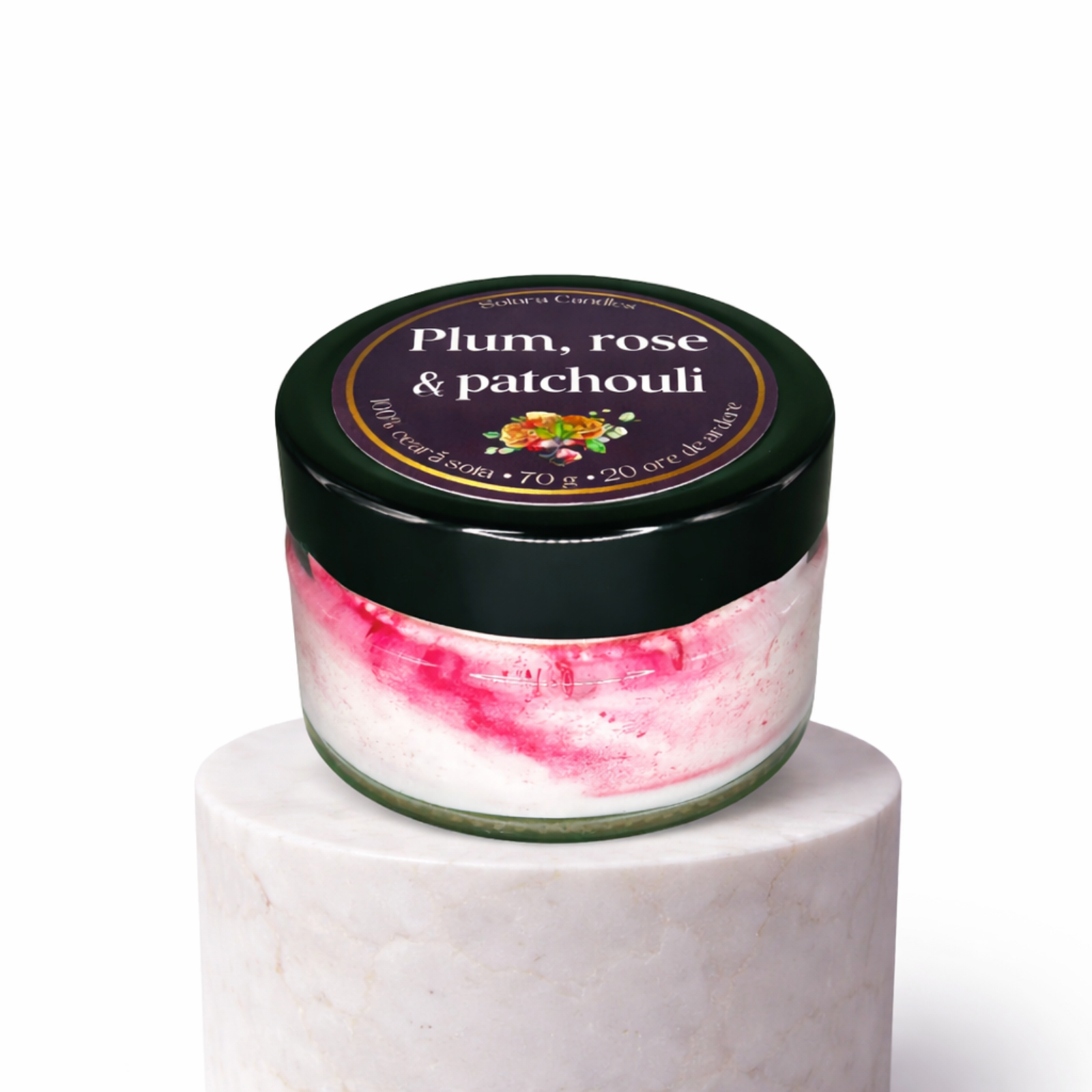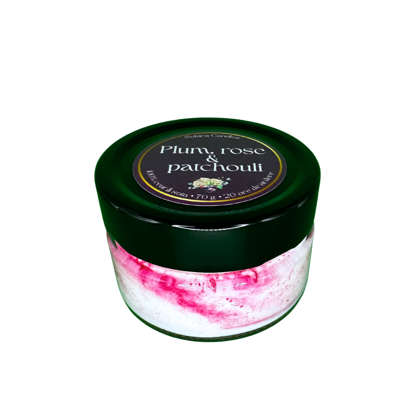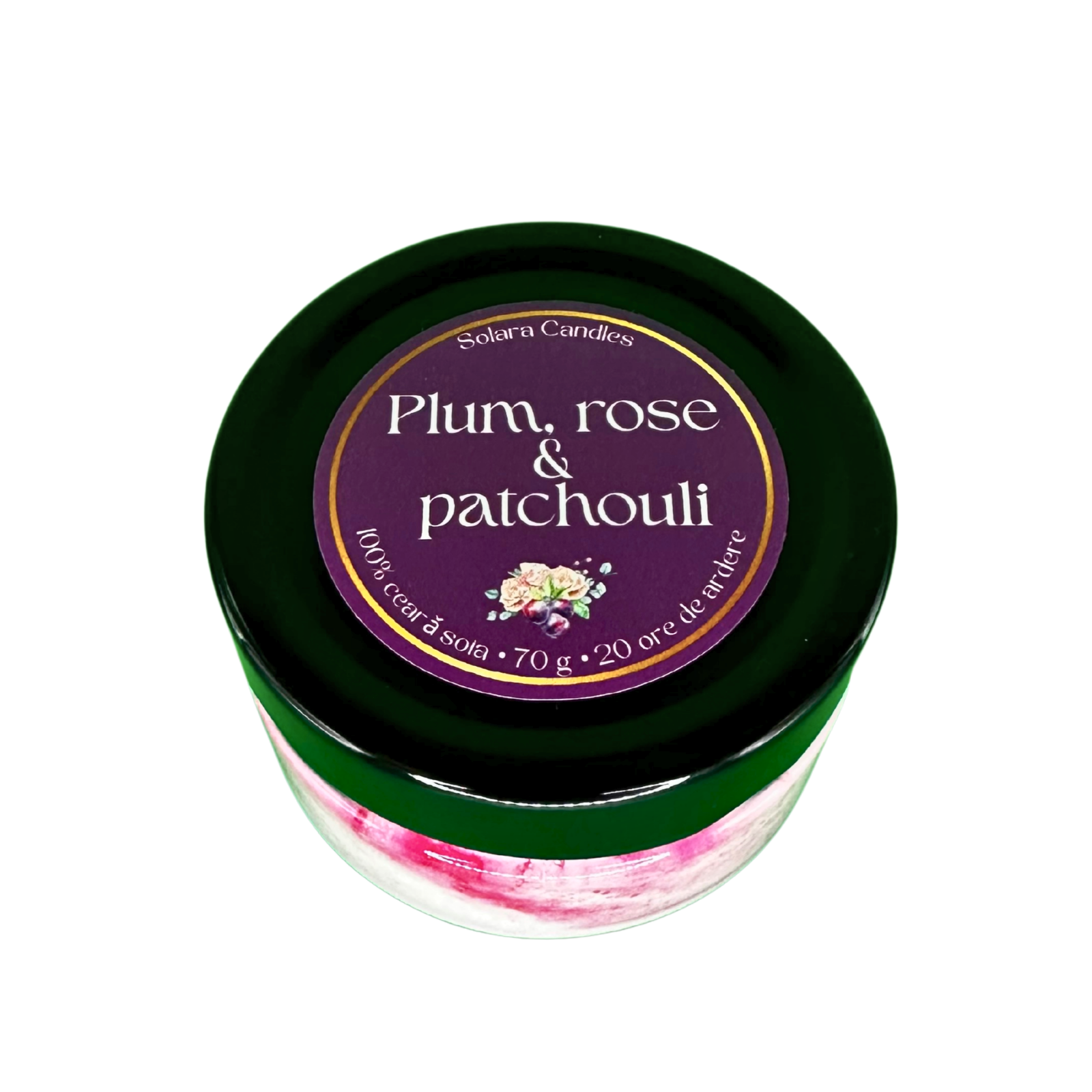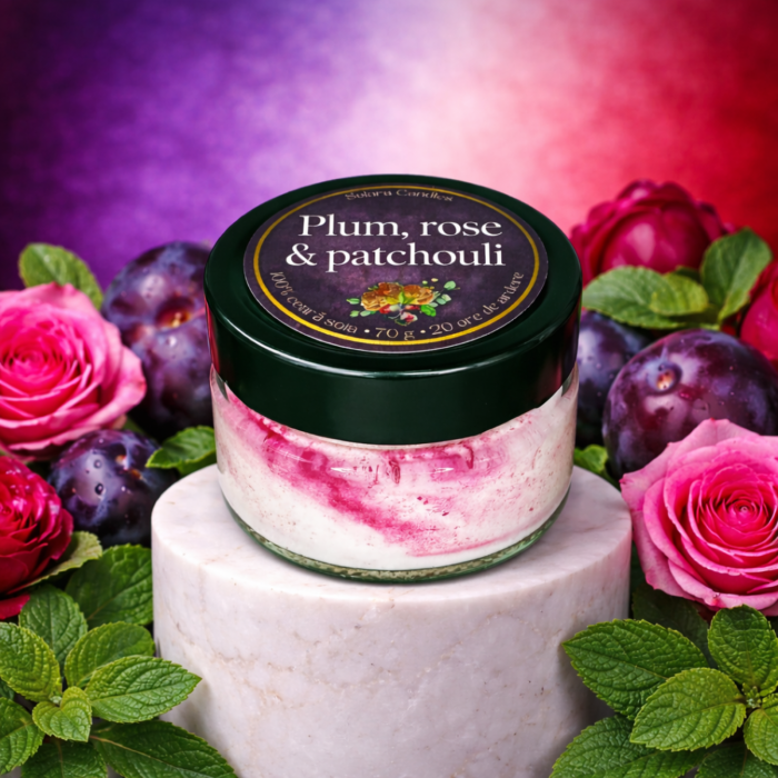 Lumânare parfumată handmade cu aroma de Plum, Rose & Patchouli - prune coapte, trandafir, patchouli