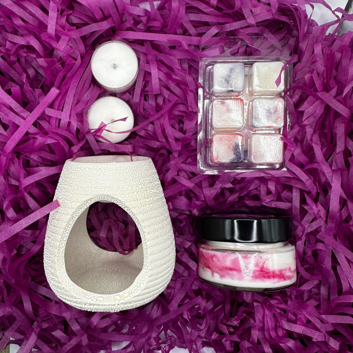 Setul conține un difuzor ceramic, un pachet de wax melt (80g), două lumânări pastilă și o lumânare de 70g, atent alese pentru a crea un ritual parfumat armonios și elegant.