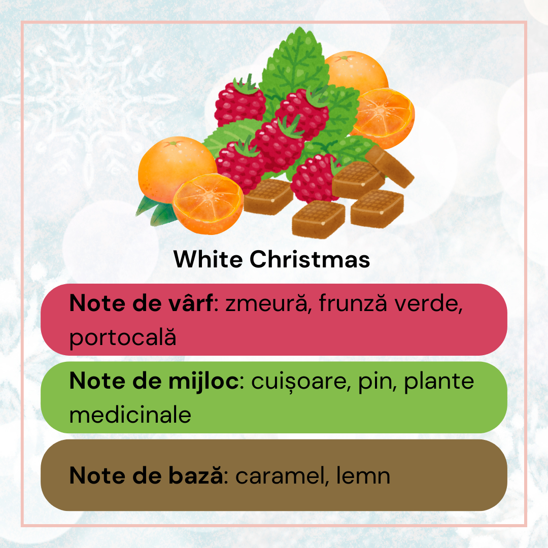 Un ulei parfumat răcoritor și festiv, care surprinde perfect magia iernii. White Christmas aduce un parfum revigorant și luminos, perfect pentru stări vesele și pline de energie. Aroma sa crocantă te poartă într-o plimbare printr-o pădure înzăpezită, unde notele fructate, verzi și lemnoase se împletesc armonios.