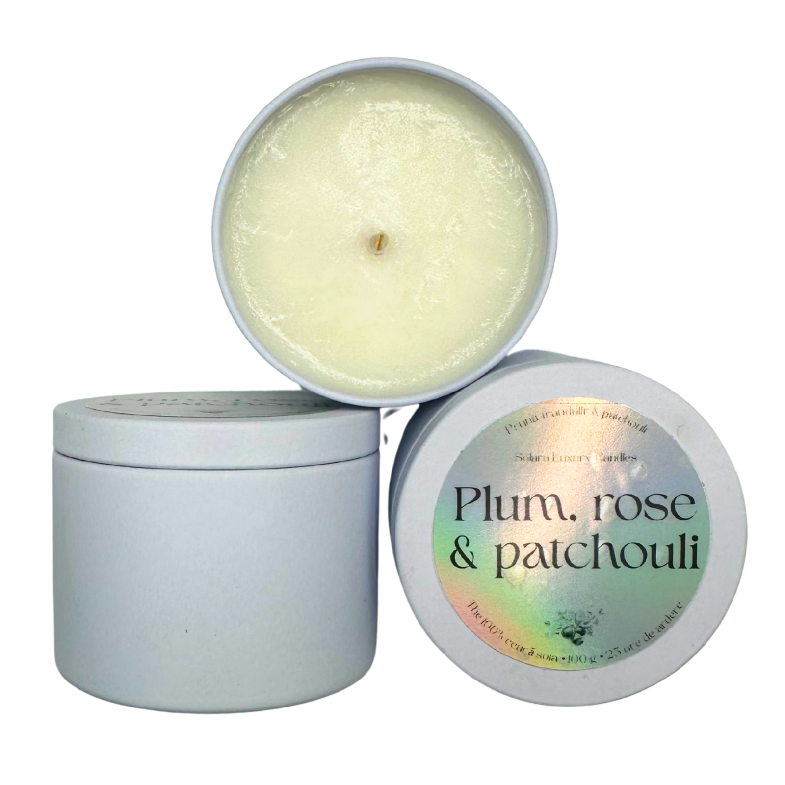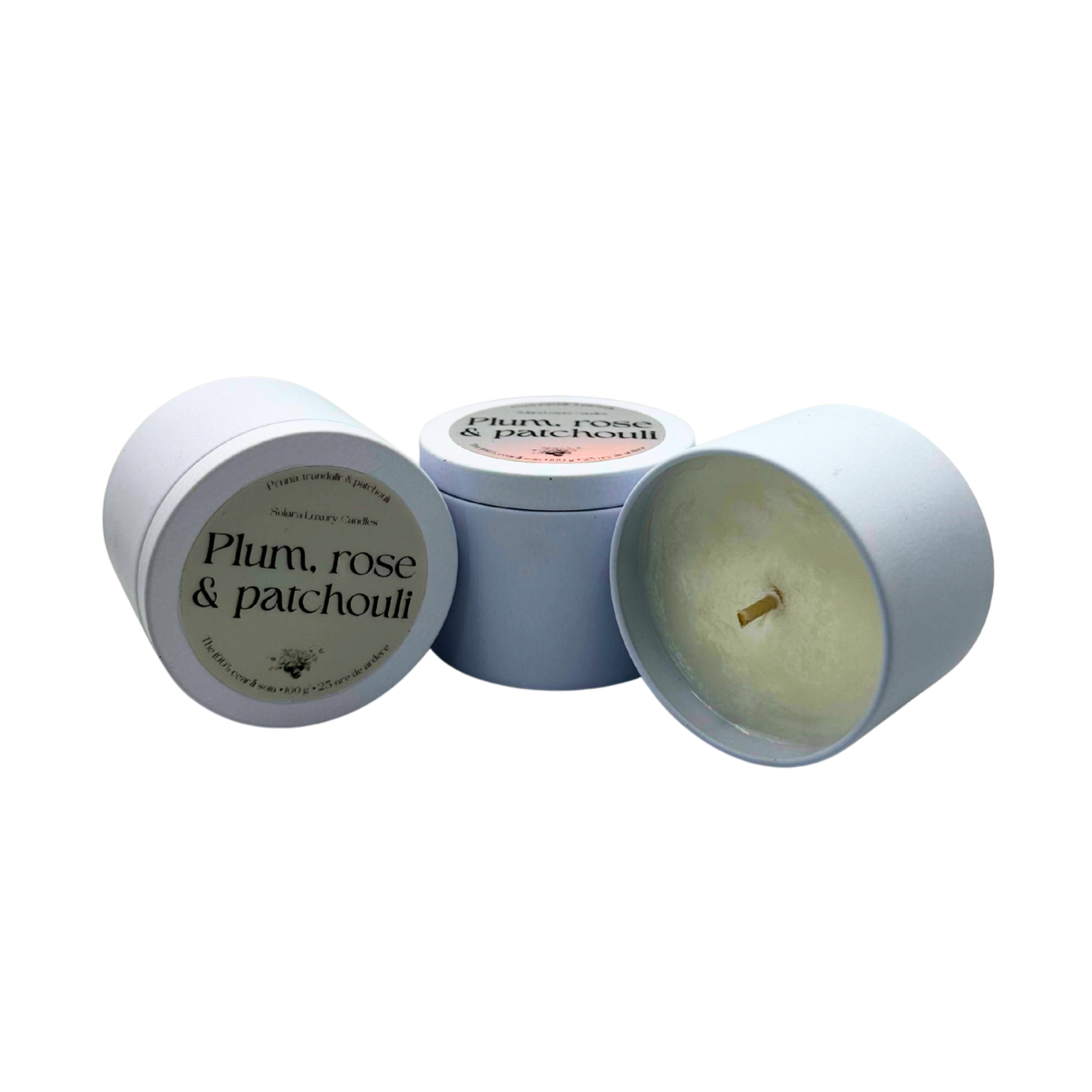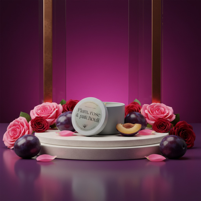 Lumânare parfumată handmade cu aroma de Plum, Rose & Patchouli - prune coapte, trandafir, patchouli