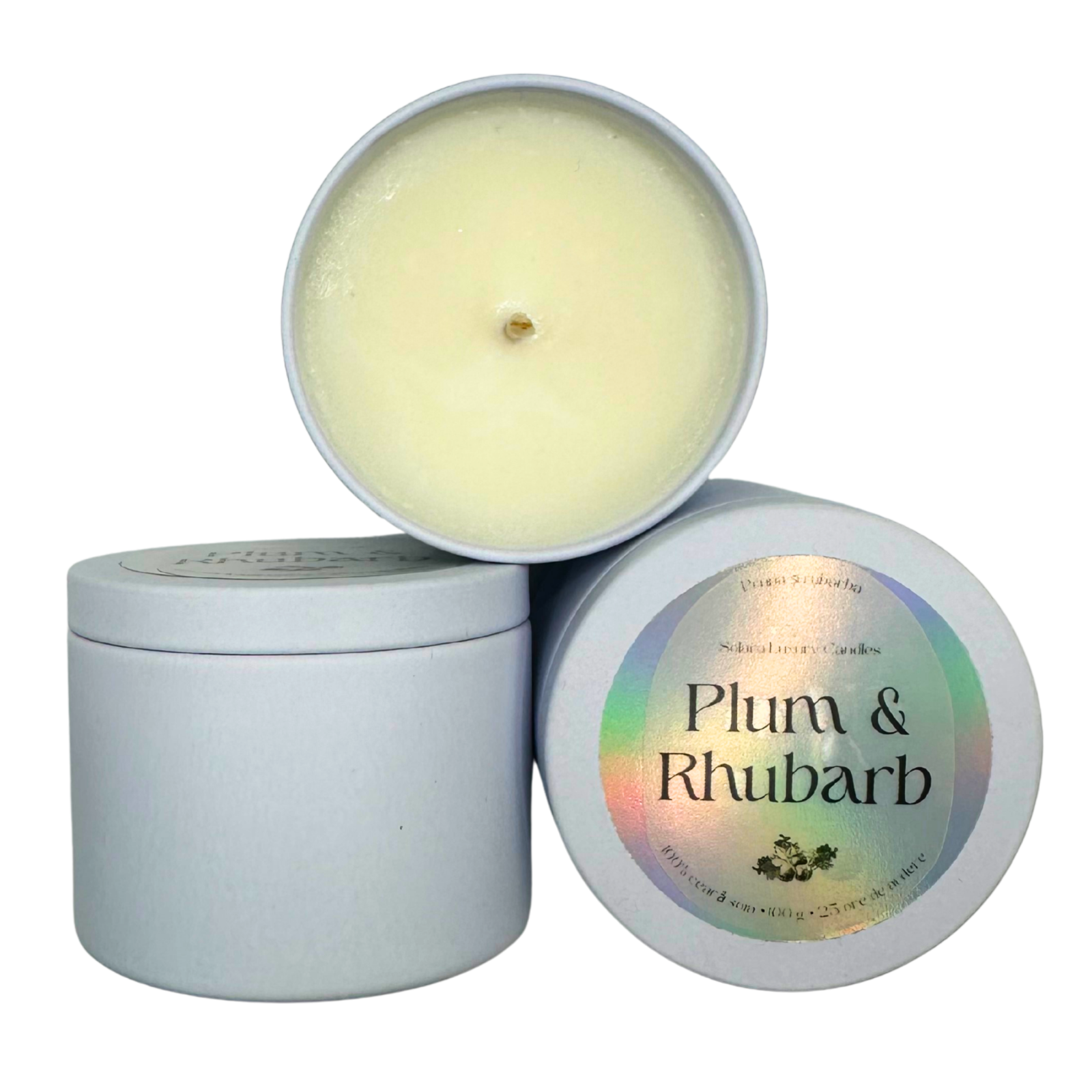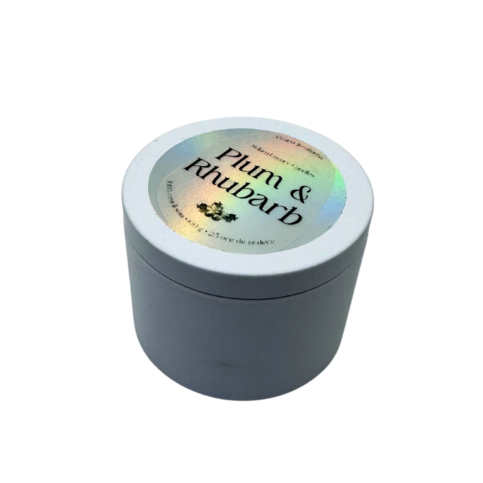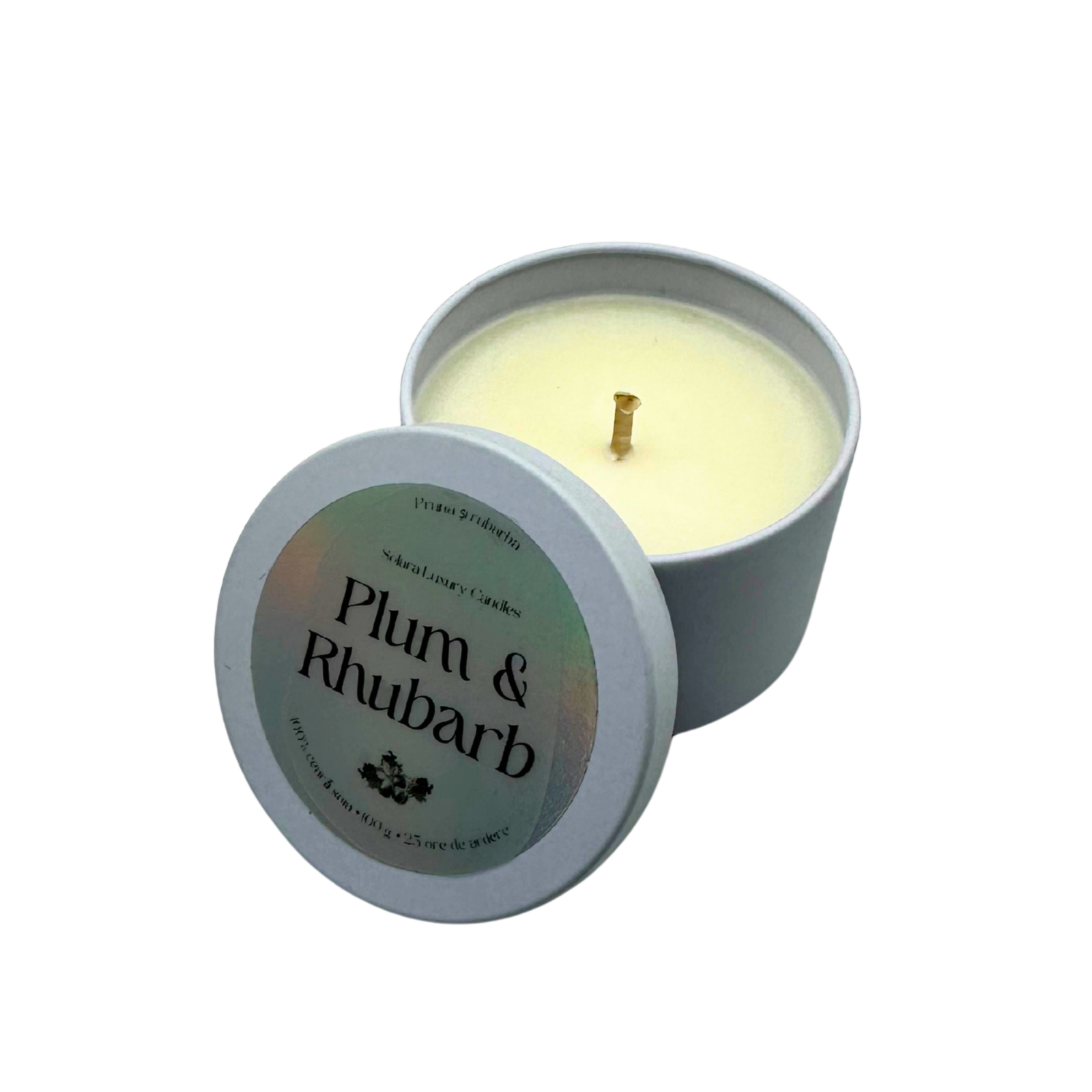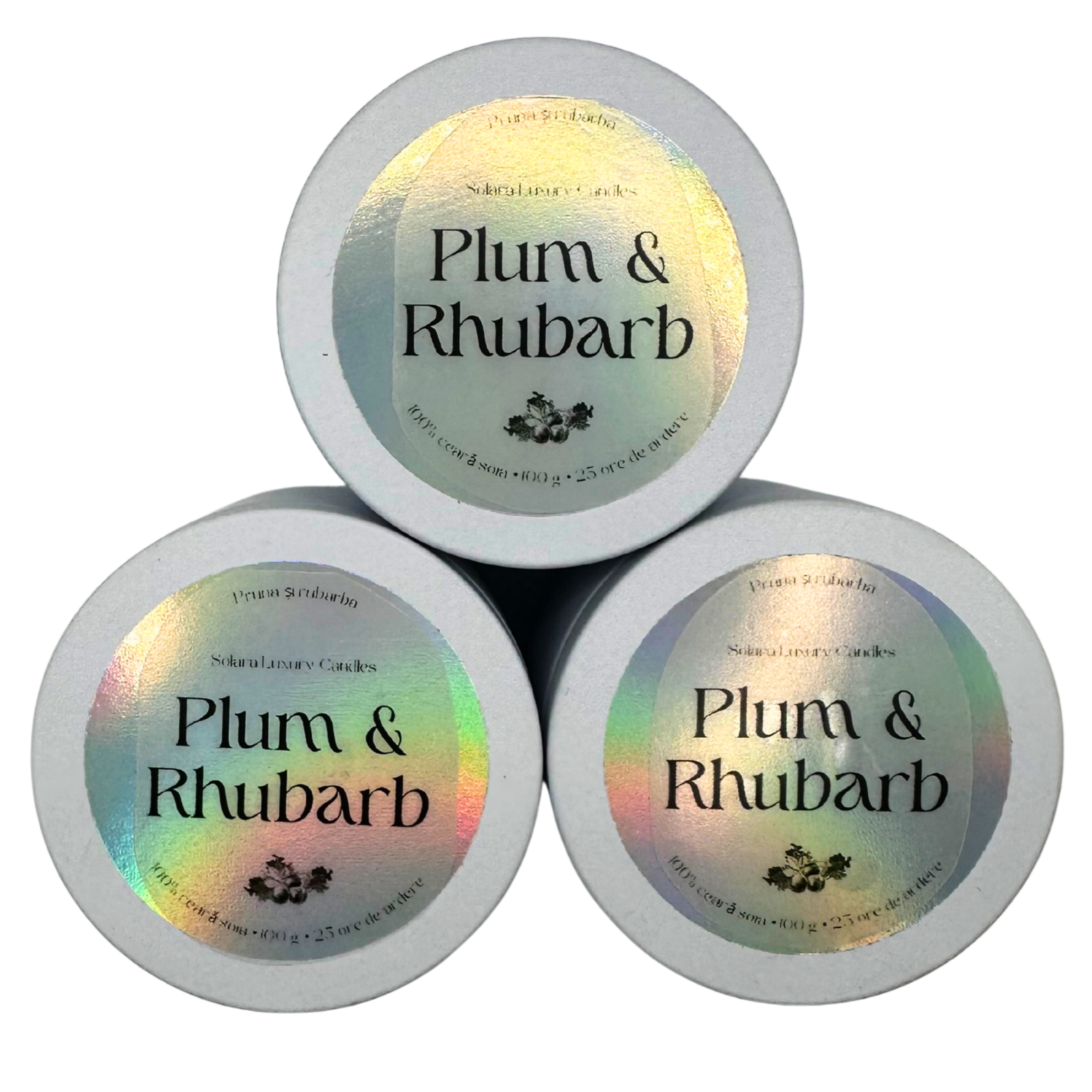 PLUM & RHUBARB, pruna si rubarba, alb mat, metalic, 100g, ardere 30h, Lumanare parfumata din ceara de soia, Solara Candles