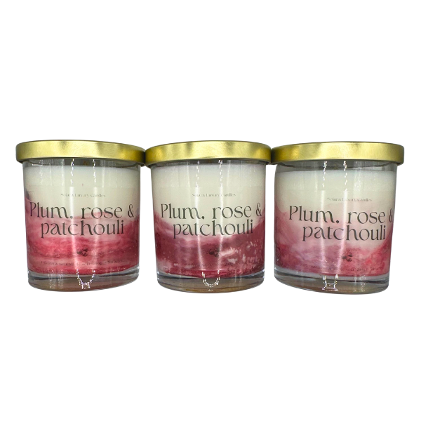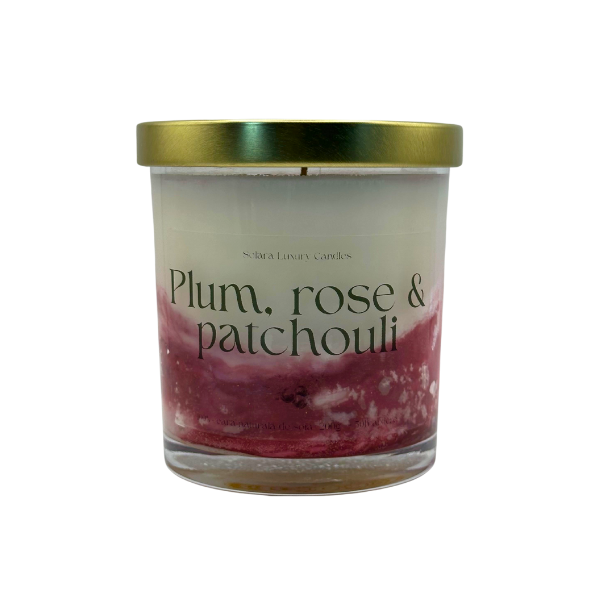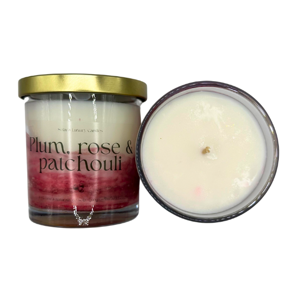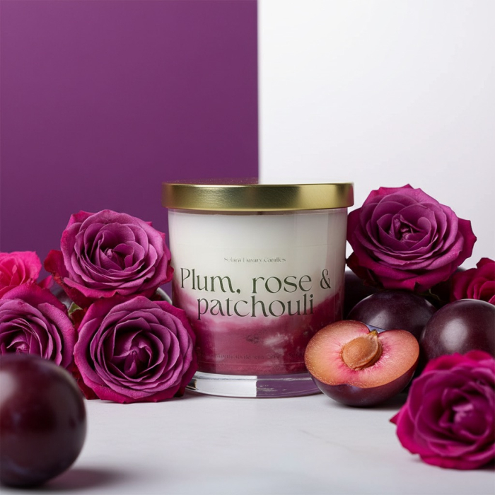 Lumânare parfumată handmade cu aroma de Plum, Rose & Patchouli - prune coapte, trandafir, patchouli